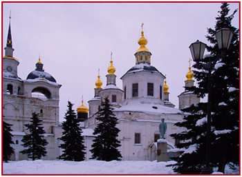 В конце XVII в. Холмогоры становится центром епархии, в ведении которой находился весь Двинский край. Церковный комплекс включает: Спасо-Преображенский собор (1685-1691 гг.), близкий по архитектуре московскому Успенскому собору, - огромное шестистолпное сооружение, завершавшееся раньше пятью мощными главами (сейчас в руинах); каменная колокольня (1685 г.); Архиерейские палаты (1688 г.)
