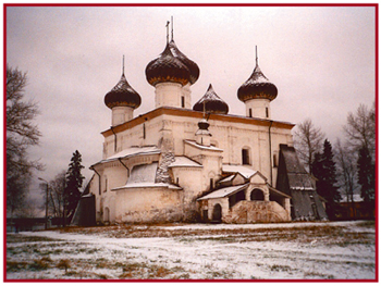 Стремление повторить (разумеется, в понимании средневекового зодчего) московские образцы оставалось характерным для городских и монастырских соборов на Севере не только в XVI, но и в XVII столетии. Еще Иван Грозный способствует этой тенденции, предоставляя денежные льготы для каменного строительства. Так было в 1587 г. при начале строительства Троицкого собора в Антониево-Сийском монастыре, расположенном неподалеку от Северной Двины. В грамоте царя Федора Иоанновича особо оговорено, что он должен быть построен «в Воскресенскую меру, что в [Ново-]Девичьем монастыре, что у нас на Москве». Мало того, для «сийского каменного дела» из столицы на Двину послан мастер Захар. Однако закончили собор через двадцать лет уже вологодские каменщики. Особенностью его архитектуры стало резкое выделение средней главы не только размерами, но и аркатурно–колончатым поясом. В прошлом фасады завершались закомарами.