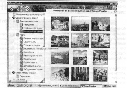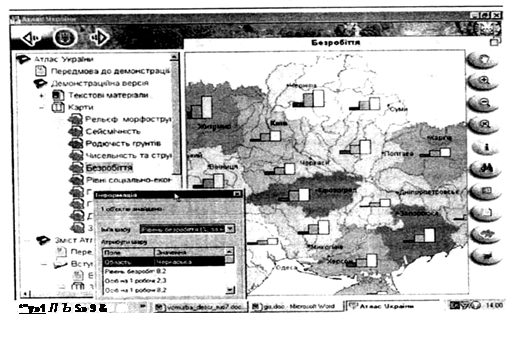 Электронный Атлас Украины рассчитан на широкий круг пользователей и предназначен прежде всего для справочно-информационных и пользовательских целей. Он позволяет получить общее и достаточно полное представление об изображенных на его картах природных и социально-экономических процессах и может стать учебником при изучении этих процессов. Главной составляющей информационного обеспечения Атласа Украины является набор электронных карт. Он включает в себя информацию о геополитическом положении Украины, ее истории, природных условиях и ресурсах, населении, культуре, религии, экономических и социальных условиях проживания населения, финансах и бизнесе, политике и экологии.