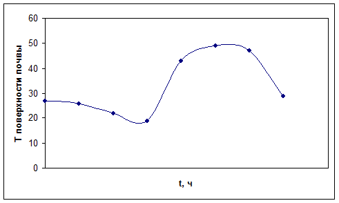 Суточный максимум почвы наблюдался в полдень (49о С), когда почва поглощала наибольшее количество тепла; а суточный минимум, как и у температуры воздуха в 6ч, перед рассветом, когда радиационный баланс становится равным нулю.