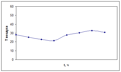 Исследования проводились в августе, поэтому разница между суточным максимумом и суточным минимумом – суточная амплитуда температуры – в исследуемом случае достаточно высока (30о С). Солнечная радиация у земной поверхности велика днем, а ночью наблюдается эффективное излучение. Следовательно, судя по большой амплитуде, день был безоблачным.