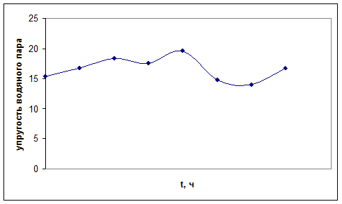 За счет изменения в течение суток температуры и интенсивности турбулентного перемешивания, мы наблюдаем двойной суточный ход абсолютной влажности – упругости водяного пара. Максимумы суточного изменения приходятся на 6ч, когда только начинает прогреваться земная поверхность и в послеполуденные часы. А максимумы в 9ч и 3ч.