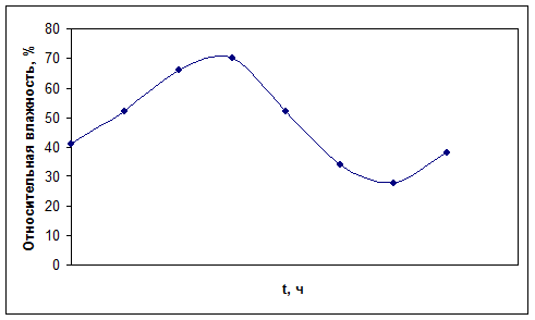Относительная влажность изменяется обратно пропорционально изменению температуры, поэтому суточный максимум относительной влажности совпадает с минимумом температуры. Также можно проследить, что день был довольно сухим, так как средняя относительная влажность в этот день равна 48%.