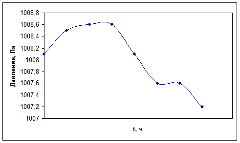 Периодические изменения давления определяются его суточным ходом. Кривая суточного колебания давления, как правило, имеет 2 минимума и 2 максимума. Хотя в рассметриваемом случае (рис№5) выражен только один максимум – в районе 3ч, это вызвано охлаждением воздуха. Снижение давления к 12-15ч объясняется нагреванием воздуха, так как совпадает с суточным максимумом его температуры (рис№2). Далее давление снова начинает падать до 18ч, после чего снова возрастает. Влияние непериодических изменений на упругие суточные колебания атмосферы не позволяют в течение суток достичь атмосферному давлению второго максимума.