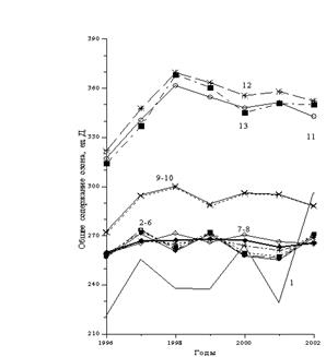 Линии на рисунке пронумерованы в соответствии с номерами станций в табл.1. На антарктической станции Восток среднегодовые значения ОСО ниже, чем на всех станциях северного полушария, хотя в конце рассматриваемого периода (в 2002 г.) среднегодовое значение ОСО превысило здесь соответствующие значения на экваториальных станциях и даже некоторых среднеширотных ( в Китайском регионе). На ст. Восток пики среднегодовых значений отмечались также в 1997 г. и в 2000 г. , что может быть связано с ослаблением интенсивности антарктической “озоновой дыры” в отдельные годы / 3 /.