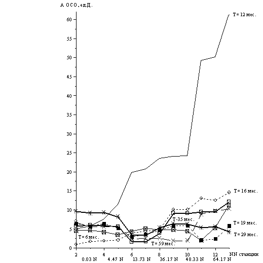Изменение амплитуды колебаний в зависимости от широты проиллюстрировано на рис. 7. Годовая волна имеет амплитуду на экваторе ~ 5-10 ед.Д., затем в области широт 10-40° N она возрастают до 20 ед.Д. и на широтах > 50° N амплитуда годовой волны превышает экваториальную в 10-15 раз, поднимаясь выше 60 ед.Д. на ст. Тура. Более или менее равномерно растет с широтой амплитуда колебаний ОСО с периодом 16 мес. (1.3 года). Амплитуда квазидвухлетних колебаний ОСО (с периодом 29 мес.) уменьшается от экватора к Северному полюсу, а амплитуда колебаний с периодом 35 мес., наоборот, растет с широтой. При этом в области широт примерно 10-30° N наблюдаются минимальные значения амплитуд квазидвухлетних колебаний ОСО (в этой области широт образуется некий “ провал” в амплитудах КДК.