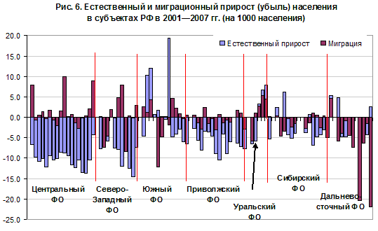 К остро проблемным регионам относится также Центральная Россия, где естественная убыль населения настолько велика, что положительный миграционный прирост не компенсирует естественных потерь населения. Демографический потенциал Центра России, в особенности его сельских районов, в результате имевшего место многие десятилетия интенсивного оттока и старения населения в значительной мере подорван.