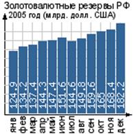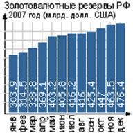 Золотовалютные резервы РФ представляют собой находящиеся в распоряжении Банка России и правительства Российской Федерации высоколиквидные финансовые активы, которые складываются из иностранной валюты, монетарного золота, специальных прав заимствования (SDR), резервной позиции в МВФ и других резервных активов. Как видно из графиков, золотовалютные резервы РФ неизменно растут, за исключением периода кризиса в 2008 году. Но сейчас экономика России постепенно набирает обороты, и вместе с тем растут золотовалютные резервы. Объем золотовалютных резервов Российской Федерации по состоянию на 19 ноября 2010г. составил 489,3 млрд долл. США.
