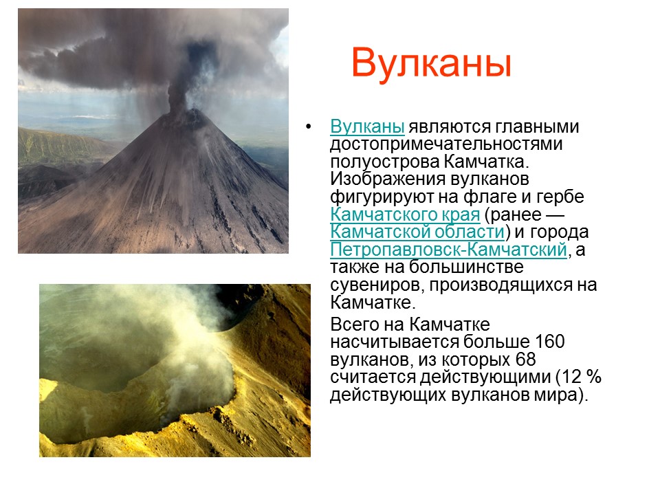 • Вулканы являются главными достопримечательностями полуострова Камчатка. Изображения вулканов фигурируют на флаге и гербе Камчатского края (ранее — Камчатской области ) и города Петропавловск-Камчатский , а также на большинстве сувениров, производящихся на Камчатке.