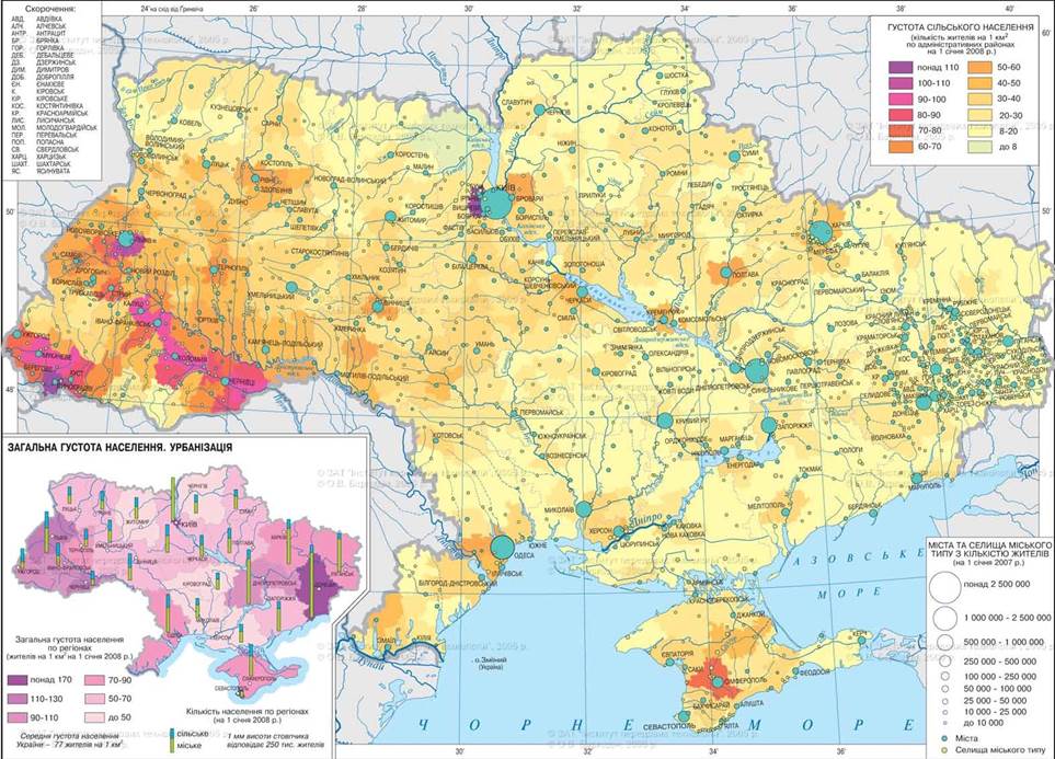 Значительно большие контрасты в размещении и плотности населения наблюдаются на уровне среднего звена административно-территориального деления Украины. В частности, на территории городов государственного, областного и республиканского значения, которые занимают всего 2,5% площади страны, проживает почти половина ее населения. Средняя плотность населения там составляет более 1 450 чел. / км2 , А в многих местах достигает более 4 000 человек / 1 км2 . Зато на остальной территории страны, входящей в сельские районы, средняя плотность - только 40 чел / км2 , Во многих районах она снижается до 20 человек / км2 .