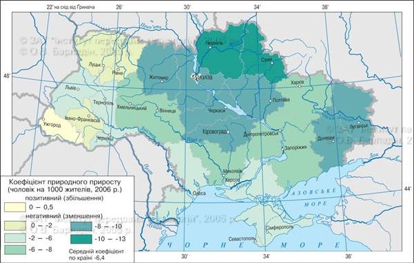 Показатели естественного движения населения имеют значительные различия в регионах Украины (см. приложение). Крупнейшие естественные потери населения наблюдаются в северно-восточных, восточных и некоторых центральных областях (-10 ‰), лидером по естественным сокращением есть Черниговская область (-13 ‰). Высокие они также в областях центрального Полесья и Приднепровья, несколько меньше - в южных регионах. Западные области и г. Киев на общероссийском фоне выглядят лучше, хотя также имеют отрицательный естественный прирост населения (- 2 ‰). Единственной областью, в которой воспроизводства населения близкое к простому, а в отдельные годы характеризуется даже незначительным положительным приростом, является Закарпатская.