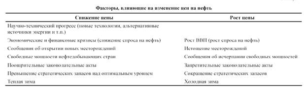 эффективности энергопотребляющих технологий и относительная конкурентоспособность других видов топлива. Предложение нефти на мировом рынке определяется мировым спросом, геолого-технологическими факторами, структурными характеристиками мирового производства и экспорта нефти, политикой нефтедобывающих государств, а также рядом других факторов, включая факторы случайного характера, такие как военные действия в регионах добычи нефти. Мировые цены на нефть, формируясь под воздействием мирового спроса и предложения, оказывают обратное воздействие, как на глобальный спрос, так и на предложение нефти. Чрезвычайно высокие нефтяные цены сдерживают спрос и стимулируют замещение нефти другими видами топлива. Одновременно высокие цены стимулируют увеличение производства нефти в регионах с относительно высокими издержками добычи. В результате такого ограничения спроса и расширения предложения создаются предпосылки для снижения мировых цен на нефть. При низких ценах на нефть, наоборот, стимулируется спрос и сокращается предложение (в результате свертывания добычи и инвестиций в высокозатратных регионах). Как результат, создаются предпосылки для последующего роста нефтяных цен.