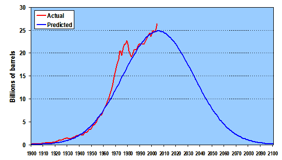 *Кривая Хубберта показывает скорость производства энергоресурсов с течением времени. Относительная крутизна спада в этом прогнозе является главной заботой в нефтяных дискуссиях. Это происходит потому, что резкое снижение в кривой производства предполагает, что мировая добыча нефти будет падать так быстро, что мир не будет иметь достаточно времени, чтобы разработать источников энергии, для ее замены, что может привести к серьезным социальным и экономическим последствиям.