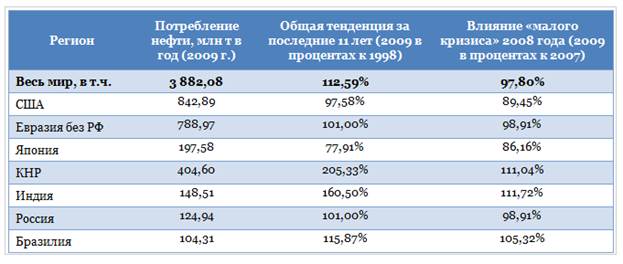 Рассмотрим общую ситуацию с потреблением нефти. Согласно BP Statistical Review of World Energy (June 2010), за 11 лет с 1998 по 2009 год потребление нефти возросло на 12,6% и составило в 2009 году чуть менее 3,9 млрд тонн.