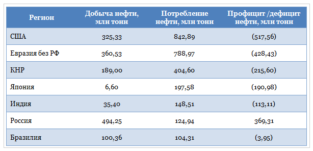 Во второй половине 2000-х годов основным мировым потребителям нефти (за исключением России) «не хватало» примерно 1,4-1,5 млрд тонн нефти. Иными словами, основные потребители нефти обеспечены собственной добычей только примерно на 45%. Более половины потребностей в нефти они вынуждены покрывать за счет импорта.