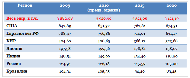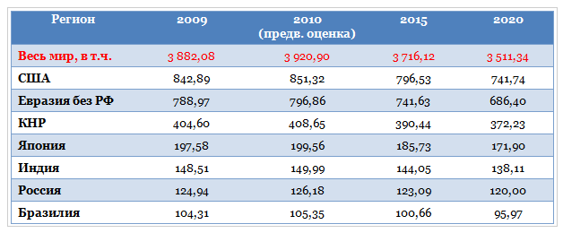 В предстоящие 10 лет мировой ВВП будет падать в среднем на 1% в год и к 2020 году составит 90% от уровня 2010 года. Такое падение ВВП вызовет снижение спроса на нефть как минимум на 10%. При этом в наибольшей степени сократится спрос в развитых странах: США, ЕС, Япония, где падение составит 12-13%, а в КНР, Индии и Бразилии падение составит порядка 7-8% в связи с тем, что сокращение продукции отраслей, ориентированных на экспорт, до некоторой степени будет компенсировано развитием внутреннего спроса.