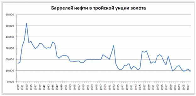 3. Соотношение цен нефти и цен золота в свою очередь подвержено следующим закономерностям: в послевоенный период в моменты кризисов за унцию золота дают порядка 20 баррелей, а в период роста и всяческого процветания – около 9-10 баррелей. Ниже на графике представлено соотношение цен на нефть и цен на золото: