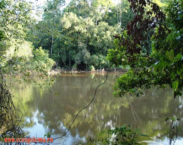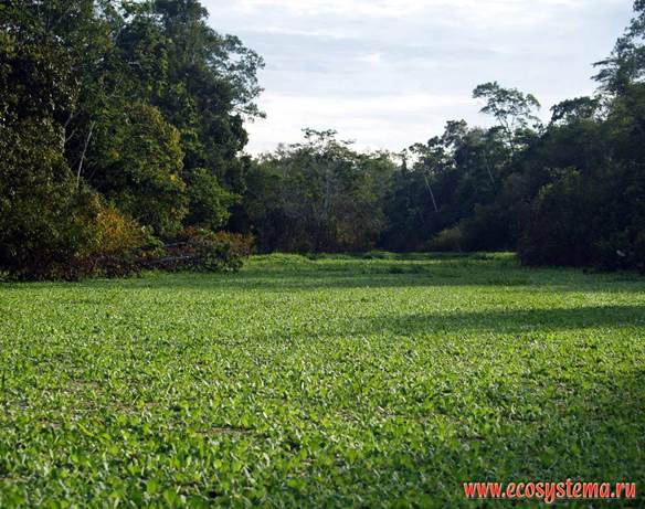 Наименее богата растительность вдоль рек на длительно затопляемых территориях. Они обычно лишены почвенного покрова и покрыты топким илом, который обволакивает стволы деревьев до высоты нескольких метров. Наземный растительный покров и подлесок снабжены дыхательными корнями и корнями-подпорками. Для игапо типична цекропия — дерево средней высоты с широкими беловатыми листьями и корнями-подпорками. Также много лиан и эпифитных растений, ярко и красиво цветущих. Поверхность стоячих и медленно текущих вод покрыта различными водорослями и водными растениями, среди которых особенно замечательна виктория-регия (Victoria regia) из семейства кувшинковых с листьями диаметром до 2 м, способными выдержать груз до 50 кг. Ее ароматные крупные цветки за время цветения постепенно меняют свою окраску от белой до пурпурной, семена съедобны.
