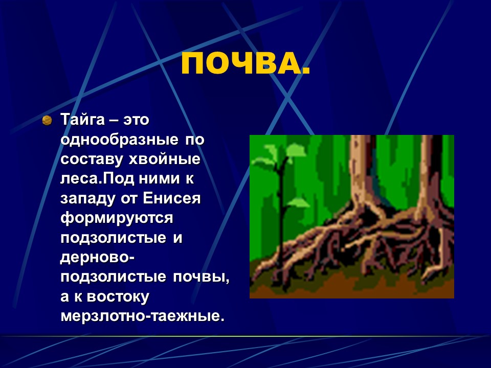 * Тайга – это однообразные по составу хвойные леса.Под ними к западу от Енисея формируются подзолистые и дерново-подзолистые почвы, а к востоку мерзлотно-таежные.