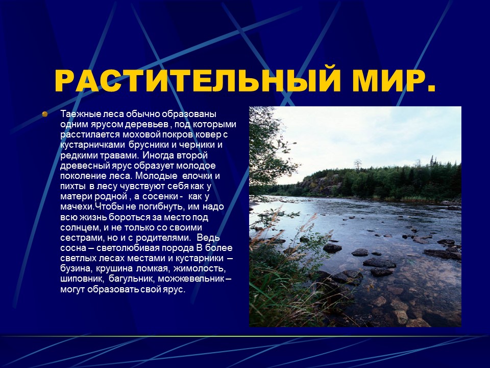 * Таежные леса обычно образованы одним ярусом деревьев , под которыми расстилается моховой покров ковер с кустарничками брусники и черники и редкими травами. Иногда второй древесный ярус образует молодое поколение леса. Молодые елочки и пихты в лесу чувствуют себя как у матери родной , а сосенки - как у мачехи.Чтобы не погибнуть, им надо всю жизнь бороться за место под солнцем, и не только со своими сестрами, но и с родителями. Ведь сосна – светолюбивая порода В более светлых лесах местами и кустарники – бузина, крушина ломкая, жимолость, шиповник, багульник, можжевельник – могут образовать свой ярус.