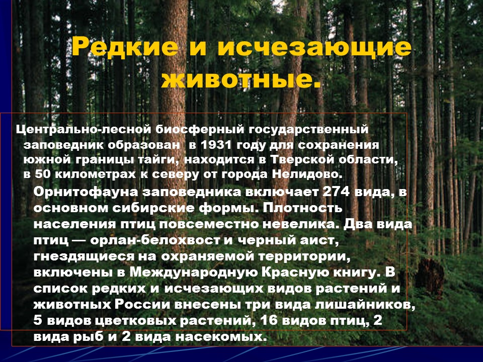 Центрально-лесной биосферный государственный заповедник образован в 1931 году для сохранения южной границы тайги, находится в Тверской области, в 50 километрах к северу от города Нелидово.