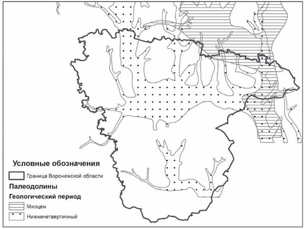 Средний период формирования долинно-речных комплексов рассматриваемой территории довольно длительный. Он включает палеодолины кайнозоя до наступления Донского оледенения. Кайнозойские палеодолины хорошо изучены начиная с неогена. При этом для бассейна реки Дон прослеживаются все этапы развития речной сети, которые являются вполне закономерными. Заложение долины Палео-Дона относят к раннемиоценовому времени и даже к верхнему олигоцену. Развитие крупной миоценовой палеореки связывают с Тамбовско-Борисоглебской ложбиной [4] (рис.).