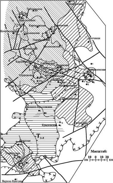 Рис. 1. Схема распространения преобразованных пород в кровле палеозоя центральной части Нюрольской СФЗ