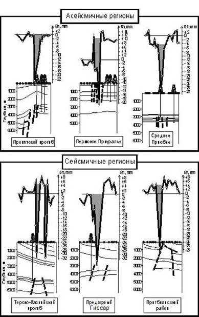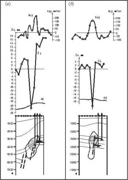 Рис. 2. Пример современных суперинтенсивных деформаций (аномалии типа g) для условий крупно- (а) и малоамплитудного (б) разломов