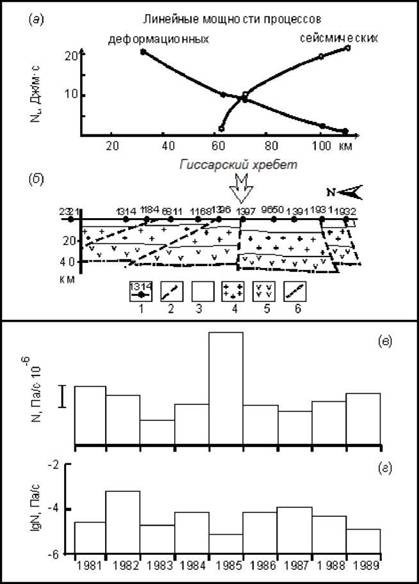 Рис. 3. Сопоставление энергетических характеристик современных деформационных и сейсмических процессов (а) по профилю Гиссарского (Шарора) хребта (б), графики удельной объёмной мощности деформационных (в) и сейсмических (г) процессов