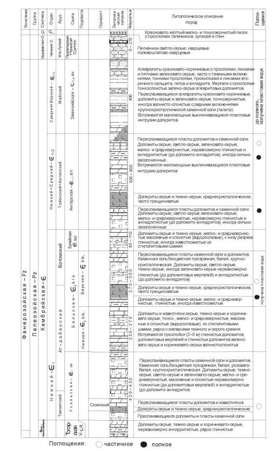 Отложения кембрия распространены на всей территории и согласно залегают на образованиях тэтэрской свиты венда-кембрия [1]. Они представлены отложениями усольской, бельской, булайской, ангарской, эвенкийской свит (рис. 1).