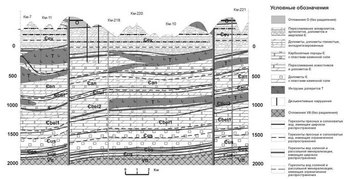 Рис. 2. Геолого-гидрогеологический разрез по глубоким скважинам