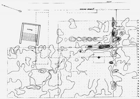 Характерные интенсивные аномальные поля приурочены в основном к южной половине участка. На остальной территории отмечаются элементы поля, либо близкие к фоновым распределениям, либо слабо подчёркивающие контуры неких строительных фрагментов.
