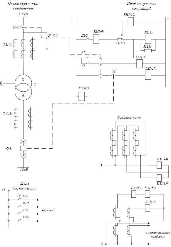 Пользуясь справочником ( [2] стр. 376 – 382 ) принимаем схему защиты на переменном оперативном токе с реле прямого действия для трансформаторов 110/10 кВ. Схема защиты приведена на рис.9.1