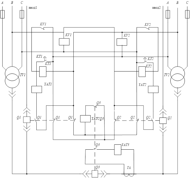 фаза А трансформатора TV2, контакт КТ1, электромагнит отключится: выключаются YATQ1, блок – контакт выключателя Q1, фаза В трансформатора TV2. Выключатель Q1 отключается, при этом блок – контакты выключателя Q1 в цепи электромагнита включения межсекционного выключателя Q3 замыкаются, тогда по цепи: фаза А трансформатора TV2, блок – контакты Q1; фаза В трансформатора TV2. Выключатель Q3 включится и первая секция шин получит питание. При этом нужно иметь в виду, что потребители третьей и частично второй категории должны быть отключены.