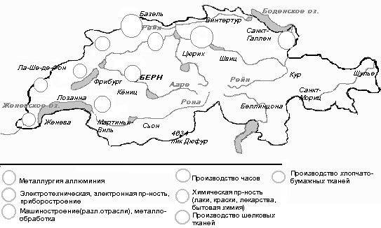 Крупных заводов в стране очень мало, и, наоборот, насчитывается очень много средних и даже мелких предприятий. Эти небольшие предприятия успешно выступают на мировом рынке благодаря тому, что они выпускают требующую очень большой квалификации высококачественную и, как правило, несерийную продукцию по индивидуальным заказам. Мелкие предприятия характерны особенно для часовой промышленности. Эта старейшая отрасль рассредоточена примерно по 800 фабрикам, из которых только три имеют свыше тысячи рабочих. Часовые предприятия ежегодно выпускают 65-68 млн. штук часов и 9/10 их направляют на экспорт. Часовые фабрики группируются в Женеве, Ла-Ше-де-Фоне, Ле-Локе и Бьенне - городах, лежащих вдоль французской границы.