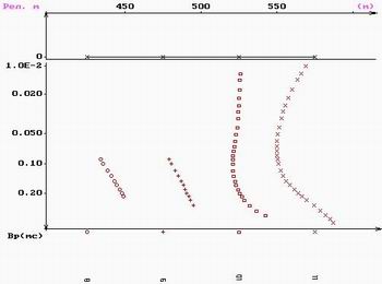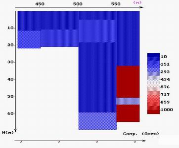 В качестве примера, демонстрирующего возможности МПП по выявлению трещинно-карстовых водонасыщенных зон, приведен интервал профиля с одной из наиболее ярких аномалий. Этот интервал соответствует переходу низкоомной (~ 150 Омм) толщи сланцев (слева) к высокоомным (более 1000 Омм) отложениям известняков (справа). На рис. 3 приведён геоэлектрический разрез этого интервала. Отрезки экспериментальных кривых в точках, по которым программой был построен данный разрез, приведены на рис.4 и 5. Это одни и те же кривые, но в разных представлениях - в вертикальном и в горизонтальном. В последнем случае можно более рельефно увидеть аномальное понижение сопротивления в районе пикета 550 м, где и была заложена скважина с очень хорошим дебитом. А водовмещающими, как показало бурение, оказались трещины и карстовые пустоты в известняках заполненные глиной.