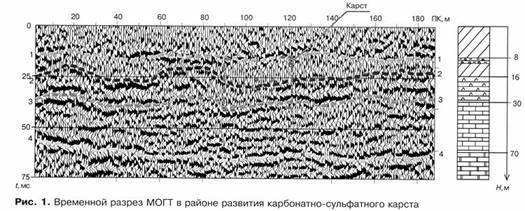 Первый пример относится к территории, где развит карбонатный карст в пределах нефтяного месторождения на юге Пермской области (Рис.1). Необходимость исследований обусловлена проблемой сохранности инженерных сооружений, обеспечивающих эксплуатацию месторождения. На временном разрезе, отмечается ряд наиболее динамически выраженных осей синфазности, которые соответствуют целевым сейсмическим отражающим горизонтам (ОГ), приуроченным к конкретным геологическим границам. Стратиграфическая привязка ОГ выполнена в соответствии со скоростным законом, установленным в процессе обработки. Так, до времени в 16 мс скорость 1000 м/с, до 30 мс - 1800 м/с, до 60 мс - 2600 м/с. Следовательно, ОГ1, регистрируемый на времени приблизительно 16 мс, находится на глубине 7 - 8 м, ОГ2 - 12 - 14 м, ОГЗ - 30 - 32 м и ОГ4 -75 - 78 м. В соответствии с априорной геологической информацией можно предположить, что ОГ1 - приурочен к промежуточной границе в толще суглинков (щебень, глина), ОГ2 - кровля гипсов, ОГЗ - их подошва, ОГ4 - кровля доломитов.
