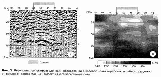Второй пример иллюстрирует возможности инженерной сейсморазведки на площади с предположительно техногенным разрушением приповерхностных отложений (Рис.2). Данная площадь находится в зоне влияния горных работ калийного рудника, а область разрушения пространственно совпадает с краевой частью отработки. Основная задача исследований заключалась в оценке пределов распространения разрушений по разрезу и по площади. Наблюдения проводились по сети профилей в пределах жилой застройки частным сектором.