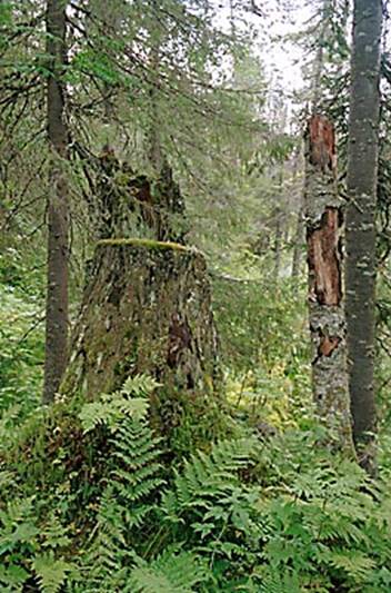| Рис. 24. Истощение доступных лесных ресурсов в обжитых районах приводило к перемещению лесозаготовительной деятельности на водоразделы, удаленные от сплавных путей. Пень от крупного кедра, найденный на расстоянии более 10 км от сплавной реки. Пермская обл. Фото П. Потапова. |