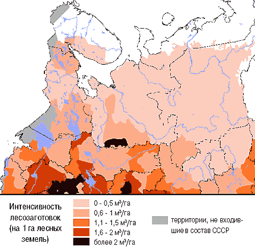 | Рис. 25. Интенсивность лесозаготовок по лесохозяйственным округам в 1934 году. (Большой Советский атлас..., 1935 г.) |