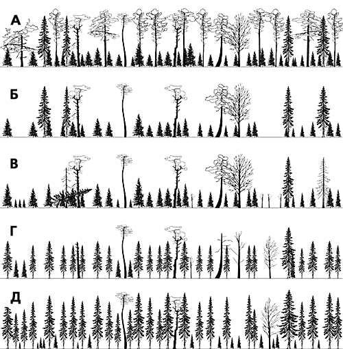 Б - интенсивная подневольно-выборочная рубка с выборкой всех деревьев сосны, не имеющих существенных пороков (весьма характерное для конца XIX - начала ХХ веков на Европейском Севере России хозяйственное мероприятие). Благодаря работе в зимнее время (зимняя заготовка леса преобладала, поскольку основную часть рабочих на заготовке леса составляли крестьяне, в летнее время занятые сельскохозяйственными работами) и конной трелевке бревен большая часть подпологового елового подроста сохранялась неповрежденной.