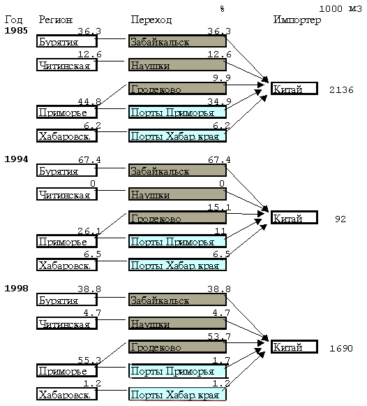 Территория 1985 % 1994 % 1998 %Респ. Бурятия 776.0 (9.2) 62.0 (0.8) 625.0 (8.1)Респ. Саха 99.0 (1.2) 18.0 (0.2) 0 (0.0)Приморский край 3797.5 (45.3) 3679.0 (49.0) 4159.6 (54.1)Хабаровский край 2962.0 (35.3) 3487.0 (46.5) 2553.3 (33.2)Камчатская обл. 125.0 (1.5) 20.0 (0.3) 3.6 (0.0)Сахалинская обл. 350.0 (4.2) 242.0 (3.2) 272.3 (3.6)Читинская обл. 280..2 (3.3) 0 (0.0) 80 (1.0)Морской экспорт 7125.5 (84.9) 7432.0 (99.0) 6072.8 (78.9)Ж/д вывозка 1264.2 (15.1) 76.0 (1.0) 1621.0 (21.1)Также как самовольные заготовители в центральном Сихотэ-Алине могут легко сдать один-два лесовоза на лесооптовую базу в Рощино или Дальнереченске за наличные деньги, владельцы мелких судов и барж на нижнем Амуре могут за комиссионные проценты отвезти заготовленный недалеко от реки лес в крупные порты Маго или Николаевск, где формируются экспортные партии на Японию и Китай. В этих портах тоже не слишком интересуются происхождением мелких партий, которые тут же теряются в огромных штабелях. Еще проще вывезти лес в Китай там, где граница проходит по Амуру и Уссури. Китайские эксперты (Вэнмин Лу, "Китайский таможенный ежегодник")подтверждают растущий поток импорта в пунктах Тонг Цзянь близ Хабаровска и Хэйхэ у Благовещенска.