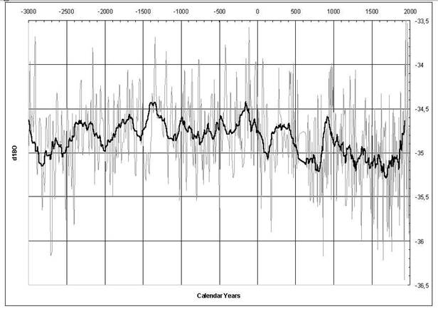 И з анализа этой изотопной кривой мы можем сделать определенные выводы о климатической ситуации в различные периоды "исторического" времени. Так, 5 тыс. лет назад температуры были на уровне современных, а затем наступило некоторое похолодание, осложненное рядом положительных осцилляций. Начиная с 2500 лет до н.э. и вплоть до пятого века новой эры эпоха была крайне теплой, с рядом незначительных похолоданий в районе 2000 г. до н.э., 1500 г. до н.э. и так далее, причем, в это время температура практически не опускалась ниже современной, а в целом было даже теплее, нежели сейчас. Наиболее холодным и резким явился, по всей видимости, локальный минимум II в. н.э., вслед за которым, после примерно трехсотлетнего теплого участка, началось существенное падение температуры, достигшее экстремальных значений в Малый Ледниковый Период, в XVI-XVII вв. Однако, на кривой в эту холодную эпоху отмечается положительная аномалия IX-XII вв., когда температуры снова оказались на уровне современных. В последнем, XX столетии, наблюдается стабильное потепление.Сходные выводы можно сделать, рассмотрев изотопную кривую по скважине GRIP [31, 32, 34, 35, 36]. Из графиков совершенно однозначно следует, что эпоха XXV в. до н.э. - IV-V вв. н.э. была весьма теплой, но затем ее сменило глобальное похолодание, продолжавшееся вплоть до начала прошлого века. Таким образом, картина температурных флуктуаций достаточно ясна. Изменения же влажности, как подчеркивалось выше, носят метахронный характер в разных областях, и поэтому их мы будем рассматривать ниже исключительно в локальном контексте.