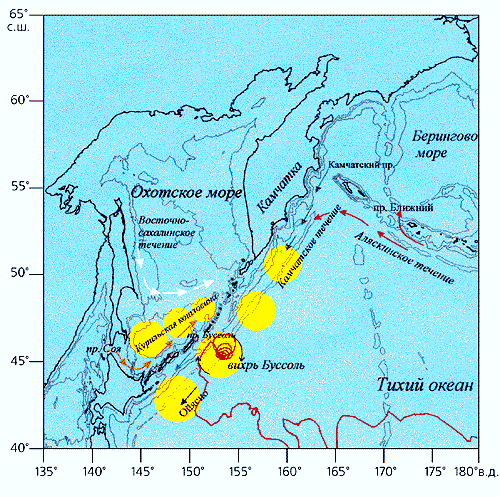 В Тихоокеанском океанологическом институте РАН уже около 20 лет ведутся наблюдения за большими антициклоническими вихрями, формирующимися на западе Тихого океана, в зоне слияния двух главных течений этого региона: Ойясио и Куросио [2-4]. Растянутые вдоль всей длины Курило-Камчатского желоба, эти вихри медленно движутся на северо-восток, против основного потока Ойясио, в субарктические воды. Свойства вихрей (их размеры, температура и соленость в ядре) не постоянны. Изменчивость такого масштаба оказалась самой большой из наблюдавшейся где-либо еще в океане. Кроме того, вихри стали новым индикатором вариаций климата океана.