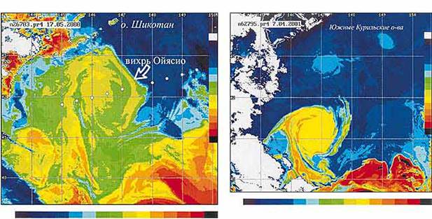 Вихри у южных Курильских о-вов. Инфракрасное изображение, полученное со спутника НОАА в Центре приема спутниковой информации Института автоматики и процессов управления ДВО РАН. Шкала цвета соответствует увеличению температуры слева направо и снизу вверх. Белые точки - положение океанографических станций на разрезе через вихрь Ойясио. Слева - в мае 2000 г., когда здесь располагался самый крупный антициклонический вихрь, который наблюдался в регионе; справа - в апреле 2001 г.