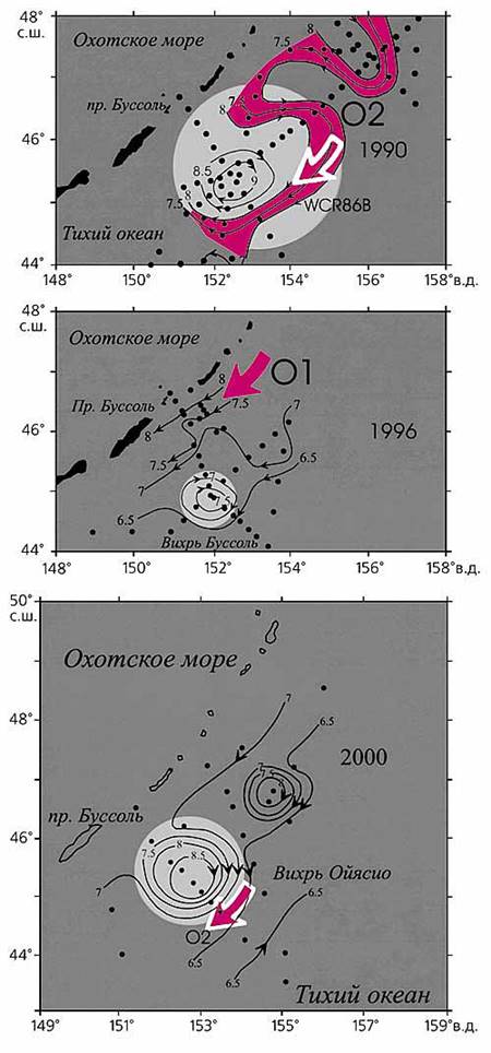 Динамическая топография (возвышения поверхности океана из-за разного распределения плотности) вихрей у пролива Буссоль в разные годы. Серым цветом показаны вихри Ойясио, красными стрелками - положение струй Ойясио. Хорошо заметно изменение размеров вихрей и смена главных струй течения: с морской (02 – 1990 г.) на прибрежную (01 – 1996 г.) и снова на морскую (в 2000 г.). Рисунок из работы [4].