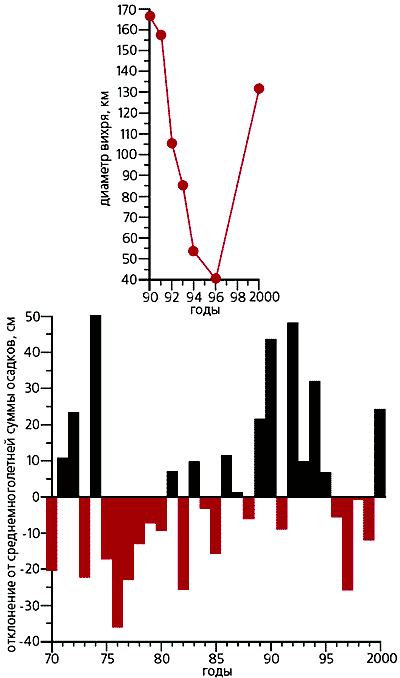 Изменение диаметра вихрей Ойясио (вверху ) и аномалии осадков (отклонение от среднемноголетней суммы) во Владивостоке. Цветом показаны отрицательные аномалии, соответствующие засухе, особенно сильной в 1976 и 1997 гг.; черным - отмечены годы с положительной аномалией, во время которых случались наводнения. |