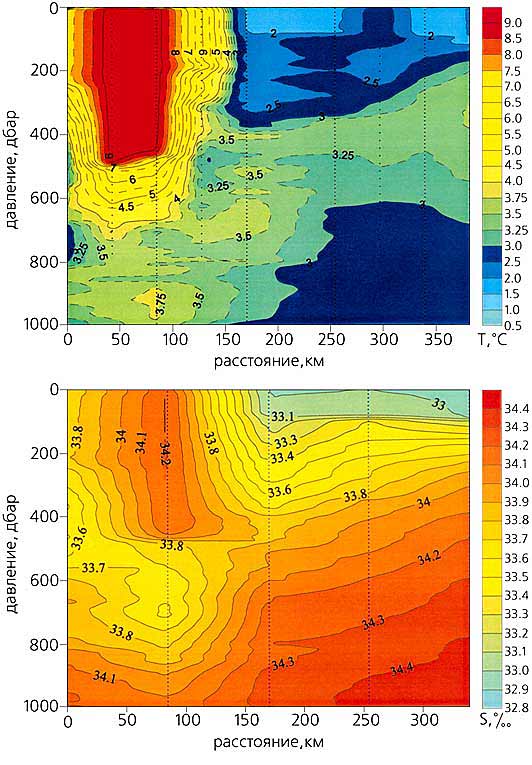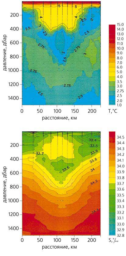 Температура (°С) и соленость (‰) в вихрях Ойясио (числа на изолиниях) в сентябре 1989 г. (вверху) и в феврале 2000 г. На разрезах вверху хорошо заметно холодное и пресное ядро, расположенное под теплым и соленым. На рисунках внизу видно, что вихрь содержит мощное теплое и соленое ядро. Диаметр вихря превышает 200 км, а глубина ядра больше 700 м. Разрезы построены с использованием данных научно- исследовательского судна “Мирай” (Японское агентство по морским наукам).