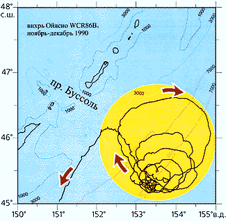 Особенно интересна продолжительность жизни вихря Ойясио. Казалось бы, он должен разрушаться из-за турбулентной диссипации (так, антициклонические ринги Гольфстрима в Северной Атлантике живут только 3-6 мес). Вместе с тем, вихрь Ойясио WCR86B продолжал двигаться вдоль Курило-Камчатского желоба еще в конце 1991 г., т.е. существовал более пяти лет. Инерционные волны, генерируемые ветром или приливом, могут не только продлевать жизнь вихря, но и регулярно поставлять энергию для перемешивания его ядра.