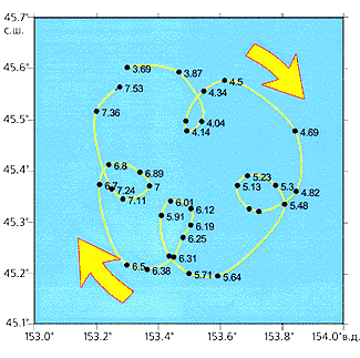 Что происходило во время этих погодных вариаций в океане? Регулярные наблюдения за течениями и вихрями начались в 90-е годы в рамках программы (совместной с Канадским тихоокеанским океанологическим институтом) по изучению климата северной части Тихого океана. Детальными съемками была охвачена обширная область субарктических вод у Курильских о-вов и Камчатки - так называемых западных пограничных течений: Камчатского и Ойясио. Одной из задач был поиск океанографических индикаторов, способных дать достаточно полное представление о происходящих изменениях климата и одновременно не требующих больших затрат судового времени. Исследования позволили выделить все детали основных течений, включая протяженную цепь больших антициклонических вихрей Ойясио, растянутых вдоль глубоких желобов у Японии, Курил и Камчатки. После длительного перерыва наблюдения были продолжены в 2000 г. в экспедиции Японского центра морских наук и технологий с участием сотрудников ТОИ на судне “Мирай”.